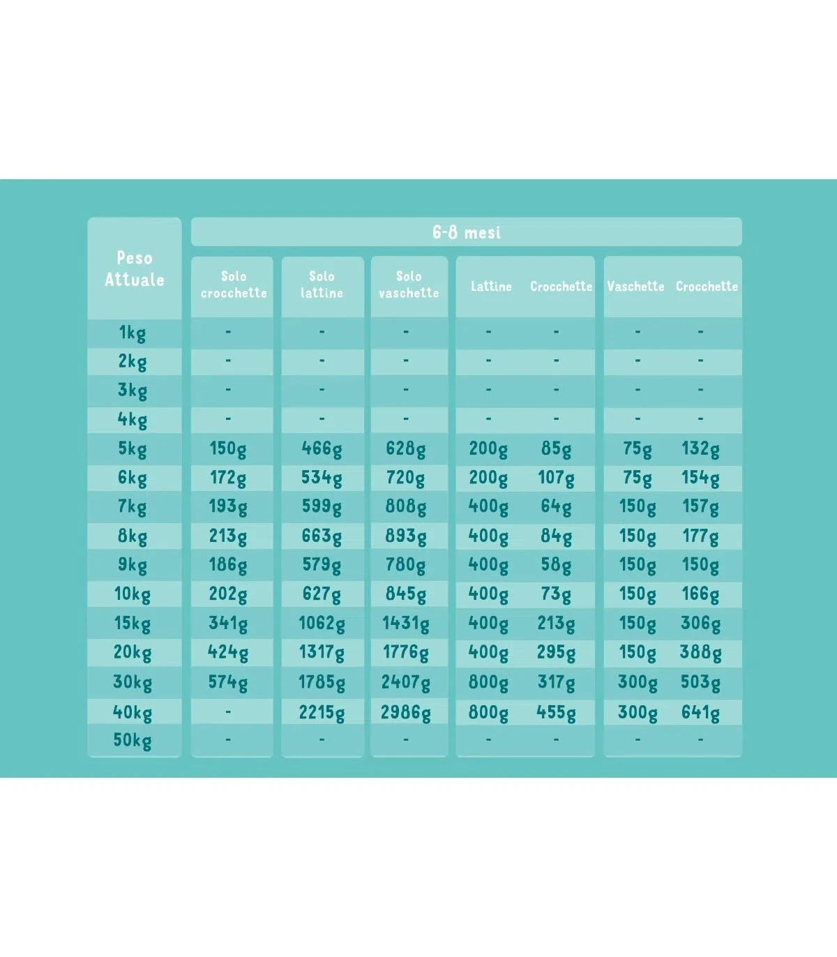 Vedi tabelle nelle immagini. Troverai indicazioni di dosaggio per cuccioli da 0 a 12 mesi d’età.